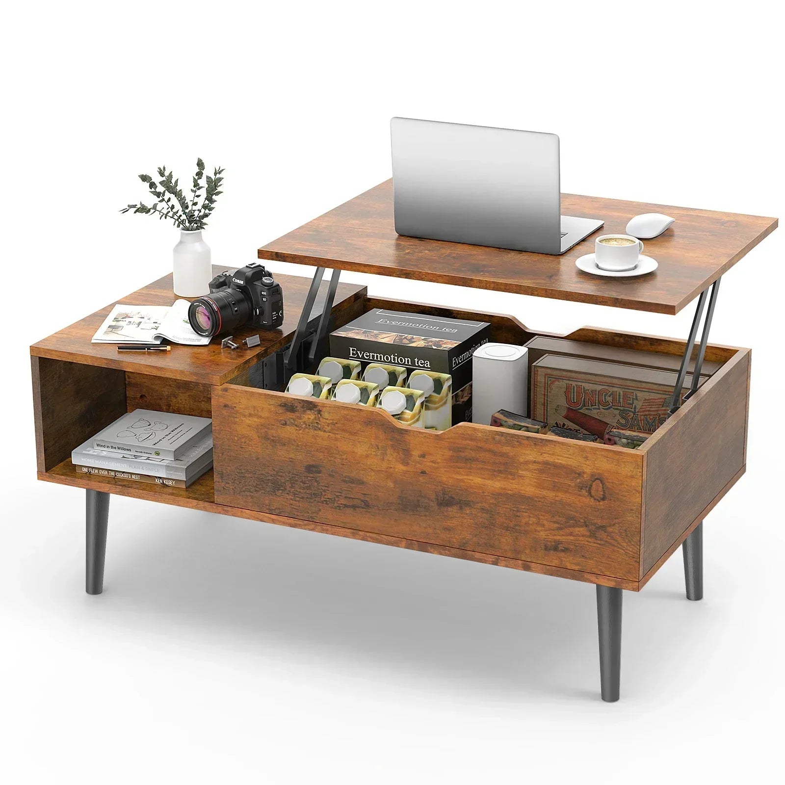 Modern coffee table with a lift-top design for adjustable height. Features a wood finish, hidden storage, and a versatile desk or dining surface.